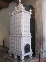 A very large ceramic wood-fired stove that would be fired-up and made very hot so heat was radiated for hours