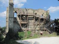 Part of an old fortification, now with scaffolding of the time to show construction, including a pulley and capstan for hoisting stone blocks and materials