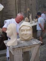 A stonemason displaying and working at his craft outside the Bayeux cathedral.