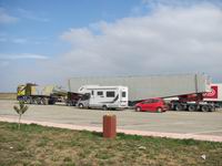 Geisty towing the little car is dwarfed by a very long 96-wheel low loader carrying a cast-concrete bridge span. The low-lowder needed 2 damaged tyres replaced and a very strong jack to raise an axle. The low-loader was pulled by a 20-wheel jockey and the whole stretches from left to right in the photo.